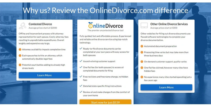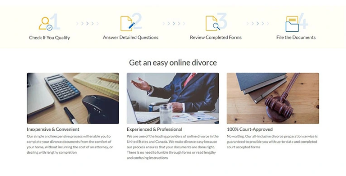 Online Divorce service is one of the best service providers as it sends all the updates of the case to their customers through email or phone. They offer a cost-effective document preparation service, and experienced professionals to guide through the divorce process and provide completed court-accepted forms. Follow simple steps like check if you qualify for the Online Divorce service, answer the detailed question form, review the completed form, and file the document.