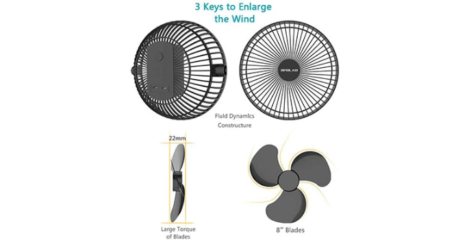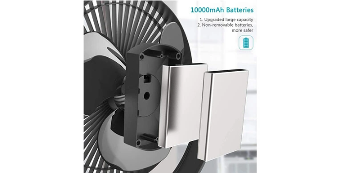 For starters, it features an assorted fan head for free-angle adjustments. It also has an energy-saving method for a battery life of up to 12 hours. It comes with dual charging ports of Type-C and MicroUSB types. It uses a 10000mAh 8 inch rechargeable battery and has up to four speeds while circulating fast air; it also comes with a sturdy clamp for outdoor support purposes.