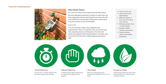 It provides an easy-to-use ergonomic dial with specifications such as start time, how long, auto shut-off time, etc. Users can set the duration to water from 1 minute to 240 minutes, as per their needs.