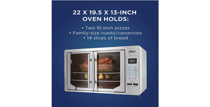 The digital controls that it includes are very convenient to use and help with functions such as baking, boiling, broiling, warming, and convection cooking, with just one touch. The control panel also features touch buttons for pizzas, dehydration, and defrosting to adjust the time and temperature settings. The Oster Toaster Oven is a product that delivers performance, versatility, and durability. The design includes a French door and a brushed stainless steel exterior that is quite attractive and convenient.