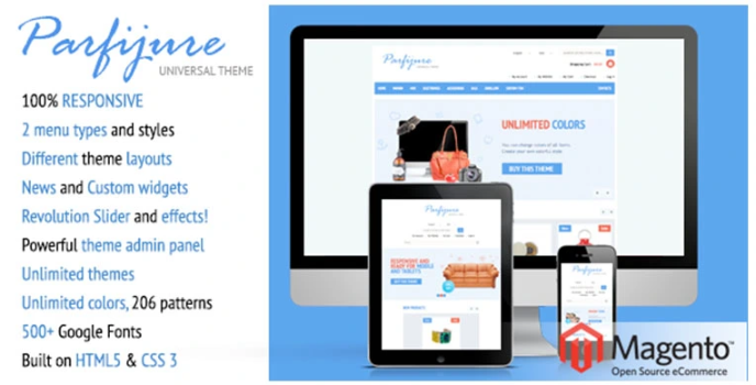 The Universal and one-handed Parfijure Magento theme is designed with cutting-edge design with a robust backend and contemporary design to attract the clients. It creates 100% responsive Magento themes to your any online Shop with modern techniques. It is integrated with a powerful admin panel that provides unlimited color options and has built-in revolution sliders. It helps create the latest HTML5 and CSS3 functionalities through its simple and easy navigation system, offers dozens of configuration options to change every theme, and allows managing the color options with theme elements, pattern backgrounds and enables them to set up the different theme settings and effects.