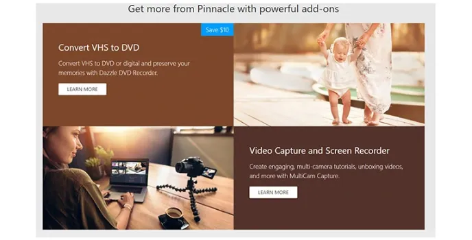 The Pinnacle software offers add-ons like Dazzle DVD Recorder and MultiCam Capture. Dazzle DVD Recorder helps in converting VHS to digital and preserving your memories. MultiCam Capture allows you to create Multi-camera tutorials, unboxing videos, and more.