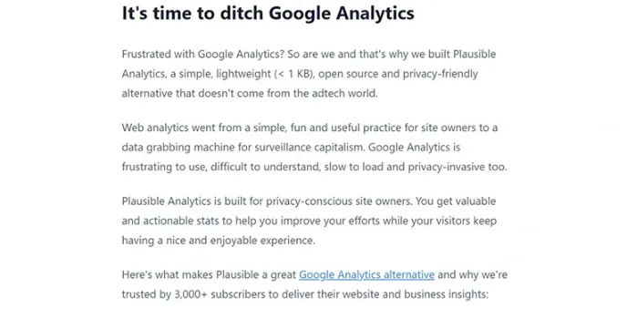 Plausible Web Analytics Tool provides excellent privacy to its owners. You can procure valuable and consistent stats that may help you to improvise your efforts. On the other hand, your visitors can visit you, procure good services and pleasant experiences. Plausible has 2,000 and more trusted subscribers and the best substitute for the Google Analytics tool.