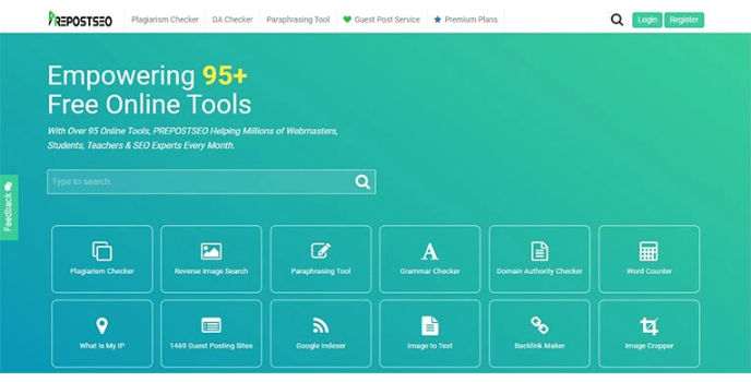 The Prepostseo online tool empowers more than 95 different online tools for plagiarism checking. It helps millions of students, reporters, webmasters, teachers, professors, SEO experts, and writers all around the globe every second. It empowers online tools such as plagiarism checker, reverse image search, paraphrasing tool, grammar checker, domain authority checker, word counter, and more.