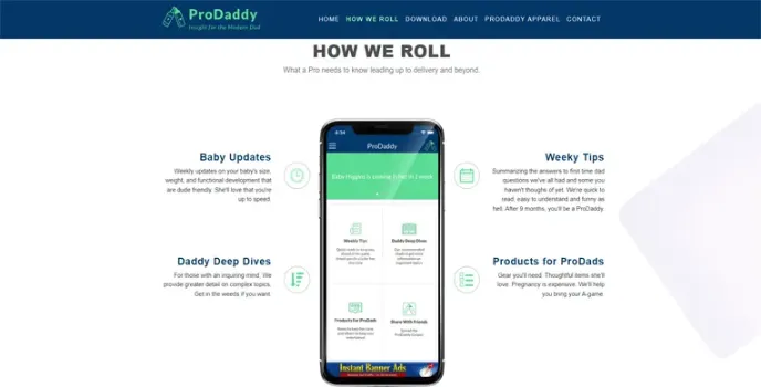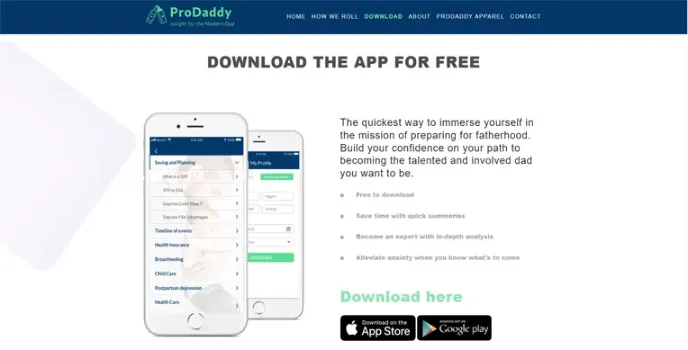 ProDaddy includes a countdown to pregnancy calendar, activities to do with your child from the moment you know they are conceived, shopping lists for your expectant wife, daily dad-to-be jokes, and more.