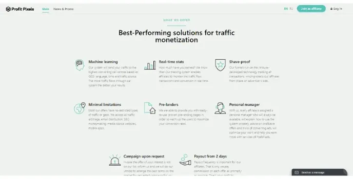 Profit Pixels is a direct affiliate advertiser that provides Crypto Affiliate Networks with machine learning algorithms that detect the highest converting call centers. It prevents duplicates with the help of an advanced AI-based system. It's also suitable for partners searches for Bitcoin affiliate networks.