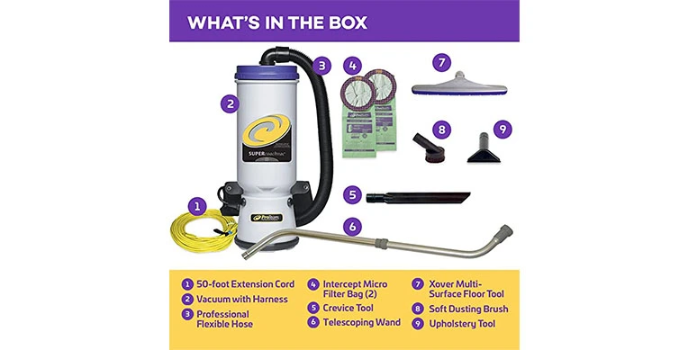 ProTeam vacuum has a four-level HEPA filtration system and is a perfect commercial tool-kit for cleaning buildings and conference halls. It also comes with a telescoping wand tool kit and is a commercial backpack vacuum cleaner.