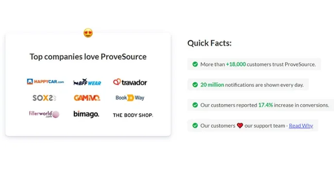ProveSource helps to build trust and enhance conversions by streaming the behaviors of the recent customer. ProveSource works perfectly with all best and popular platforms like WooCommerce, WordPress, BigCommerce, Shopify, Squarespace, and many more.