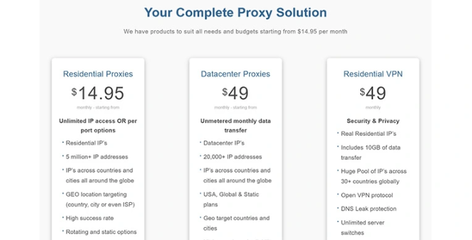 - There are three main packages offered by Proxyrack, and they are residential proxies, datacenter proxies, and residential VPN, which have prices starting from $14.95, $49, and $49 per month, respectively.