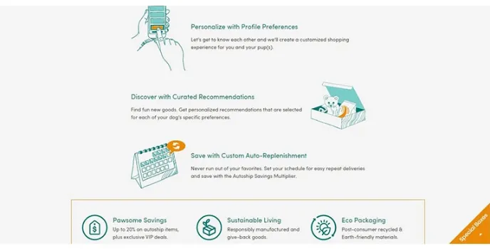 Pup Joy offers everything you want, the way you want it. It is packed with various features and provides everything in subscription boxes and customized replenishments, all mixed. To start, you have first to enter your personal information and define your profile preferences. Next, find the entire variety and get personalized recommendations selected according to your dog's needs and preferences. And lastly, save with custom auto-replenishment to set easy repeat deliveries.