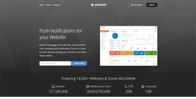 PushAssist provides the best notification management for any eCommerce website. They even provide the eCommerce owner with a daily report which provides detailed information about all data traffic done within the day, the number of likes for content, new subscriptions, and views.
