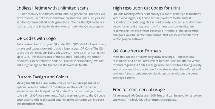 These QR codes have tracking software that allows the owners to access customer insights and payments throughout the day. They support all the vector formats in the codes like .svg, .eps, and the traditional .pdf in the best resolution. The properties of QR Code Monkey correspond to the features of other online QR generators like Beaconstac and QR Stuff Generator.