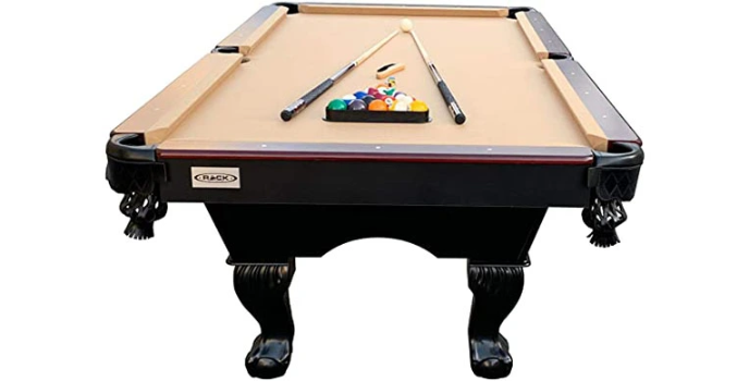 RACK Taurus pool table is designed in conventional classic design. Instead, it is reliable and comes with a tournament-grade quality. They are fabricated with premium K-66 bumpers and scratch-resistant rails and have a blended felt. It also comes with an antique tiger claw legs design that supports the iron stand. They are also crafted with leather pockets and extra-sturdy decks. The Pool table altogether guarantees a reliable environment for gaming and fun activities.