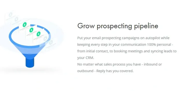 Reply.io works for both the inbound and outbound sales processes. The tool enables users to book more meetings, step in, and converse when there is a real opportunity. Besides, it also increases contact points and helps to get into a conversation with potential customers instantly. It decreases your manual routines and avoids spending more time with conventional Customer Relationship Management; rather, it finds new opportunities just through the Mailbox.