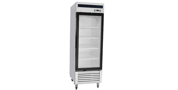 Restaurant Supplies Directโs stainless steel single-door glass industrial freezer has cubic feet of storage with an overall measurement of 27" x 31.5" x 82.2" Inches. The single-door commercial freezer has four shelves with a digital controller. It also has an adjustable temperature between the range of -8ยฐ to -1ยฐF.