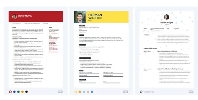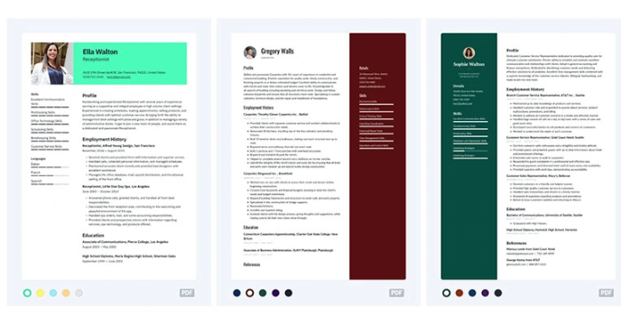 With a single click, you can save your ideal resume in any standard format, such as Microsoft Word or PDF. The cover letter maker functions in the same way as the resume creator, with the same simplicity and sleek templates.