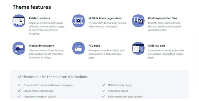 Retina Shopify themes offer a custom promotion tile with product image zoom. It also provides an FAQ page that helps to slide out carts as well. It gives a perfect display to all your products from the same collection on your product pages to continue shopping easily and tell your story by featuring multiple videos on your homepage. It helps promote sales and discounts, reach your products with special promotional tiles, and give customers a closer look and extra product details when they hover over an image.