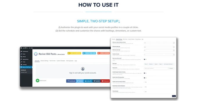 Enter the world of social media in just a few clicks. All you need to do is give Revive Old Posts (ROP) permission to post your social media accounts. Your accounts will be imported to the ROP dashboard of Revive Social. You have the convenience of customizing the plugin by creating a posting schedule and post format for your accounts.