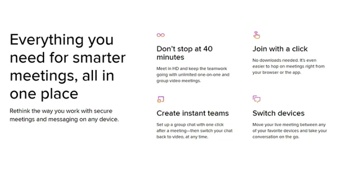The instant messaging platform doesnβt require the need for any kind of downloads. Users can easily switch between meetings and hop from one meeting to another right from the browser to the app.