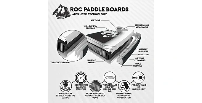 Do not worry about purchasing the right inflatable stand-up paddleboard. Roc is the best and premium quality SUP accessories with a backpack that gives you a non-slip deck and a bonus waterproof bag with the paddleboard for a wonderful adventure.