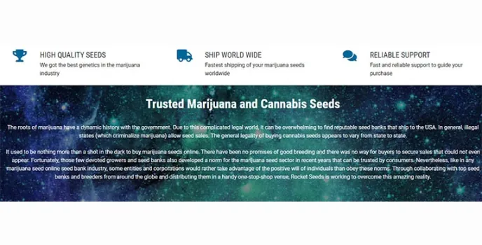 Enjoy the vast collection of marijuana seeds on a digital platform! Sign up the Rocket Seeds Bank, which permits seamless accessibility of a wide range of CBD product manufacturing for cannabis industries. Itβs pretty interesting to know that this bank has split into multiple classes and specifically provides indoor and outdoor plant production seeds. Thus, Rocket undoubtedly generates both male and female seeds for high-yield plantations.