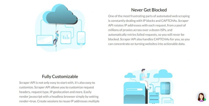 Scraper API rotates IP addresses from over ten ISPs for any request and retries failed requests immediately, so you will never be blocked. It also processes CAPTCHAs for you to work on converting websites into data that you can use.