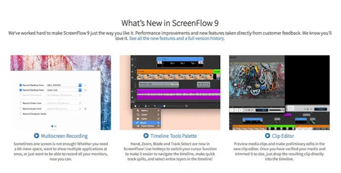 The Screen Flow helps with capturing the screen, recording videos from camera units that are attached to it and make the audio recording compatible with the system as well as from external devices. ScreenFlow continually works to upgrade itself as compared to Camtasia Screen.