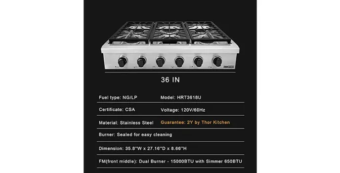 The product weighs 99 pounds. It is a gas cooktop. The product is safe as the 6 sealed burner allows easy sliding of the cookware without the need to lift it. The gas cooktop is simple to clean and has an edge over other heavy cooktops because it is very durable.