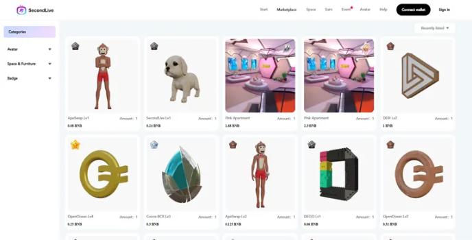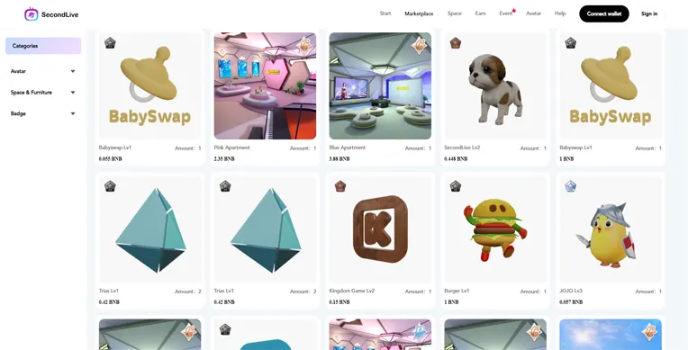 SecondLive is an NFT game that allows players to create their avatars and customize them. Players can use their avatars to travel in SecondLiveβs virtual space. To start playing SecondLive, players need to create an account and connect a wallet. SecondLive comes with a wide variety of virtual spaces to choose from. You can visit shopping malls, workplaces, dance floors, etc., for free. The NFT marketplace of this game has a vast catalog of avatars, furniture, spaces, badges, etc. SecondLive comes with three spaces: Island Space, Blue Apartment, and Pink Apartment. The native token for SecondLive is SLT, and players can earn SLT for every win.