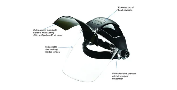 It can be used for many purposes, industrial as well as home. It weighs 1,65 pounds. It is light in weight and more comfortable to wear for work. These comfortable features can also be seen on Honeywell face shields that are used for the same purpose. It has a molded polycarbonate. It has an anti fog window. The unique feature of this face shield is it comes with flip up and down IR and UV visor. It comes with premium ratcheting headgear suspension.It arrives fully assembled.You just need to remove protective film from both sides of the face shield before using. It comes with an optional chin guard. You can see this same feature in 3M face shields. This has an adjustable headband that is quite comfortable.It is good for oxyacetylene cutting and plasma arc cutting/gouging. The dark shield is replaceable. You can wear your protective glass under the shield. There is no need to fear any hazards in your workplace as you got this face shield to protect you.
