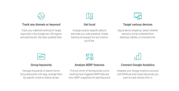 The Tool provides tracking with domain or keywords that give a local and location specified data to estimate your web presence by providing a search feature with finding out which of the keyword you are tracking and finding by viewing the Serp Snapshot for each keyword and also integrating your Google Analytics account with the Tool by providing import keywords that you want to track directly from it.