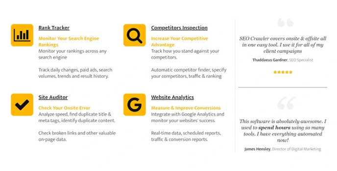 Achieve your SEO-centric goals with SEO Crawler. However, if you wish to know about the alternatives of SEO Crawler, we would suggest you go with MOZ and Link-Assistant, which have competitor research and SERP analysis.