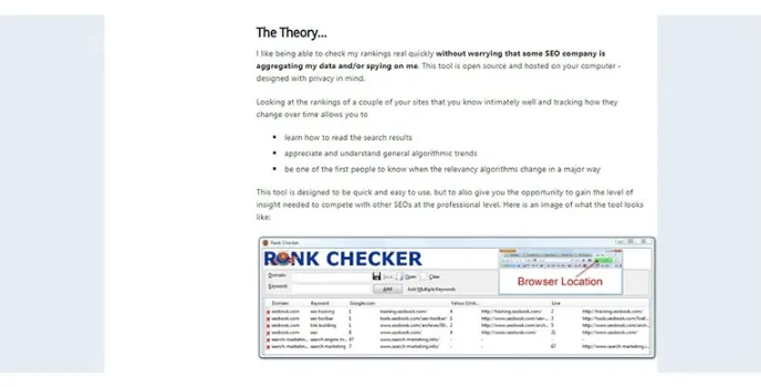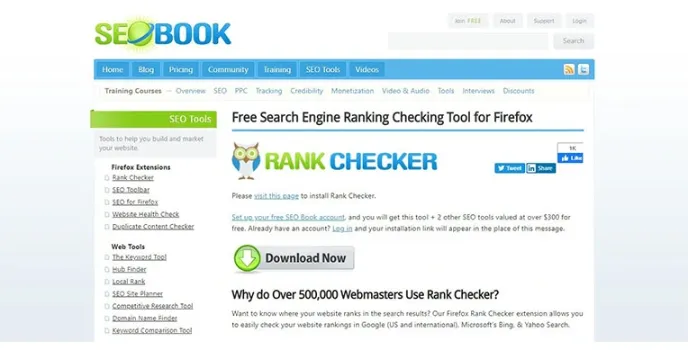 The rank checker has a Firefox extension that contains a rank checker, which has a home page, blog page, pricing, community, training, cartoon, and videos by providing rank checkers, SEO toolbars, firefox, and website health checkers, duplicate content checkers. It also has web tools that contain the keyword tool, hub finder, local rank, SEO site planner, competitive research tool, domain name finder, and keyword comparison tool.