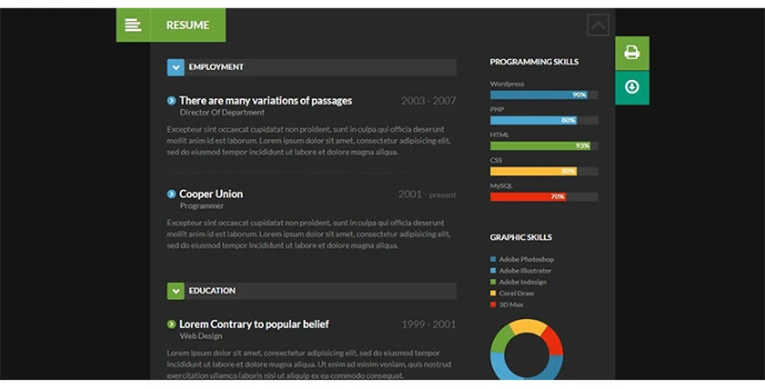 The Shift CV Virtual business card template is an HTML mobile site template that can build a personal website, CV, resume, or even a personal blog. It comes packed with various features and offers simple yet clean layouts. You can print this online resume at any point and even download it as a PDF file.