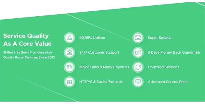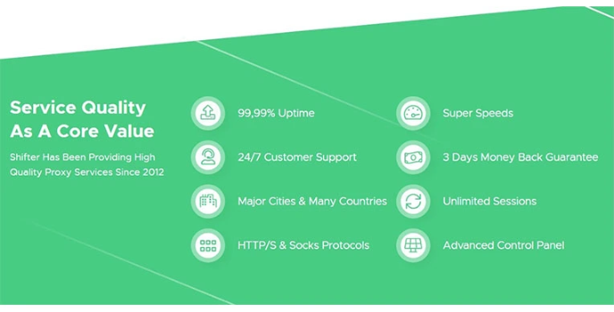 For Nine-years Shifter Proxy services have been providing High-Quality Proxy Services, and they also offer 99.99% Uptime and Super Speeds internet connection. Shifter proxies are designed with highly advanced HTTP/S & Socks Protocols and integrated with an innovative Control Panel. These proxies services are available in major cities and Countries, providing unlimited Sessions on the internet.