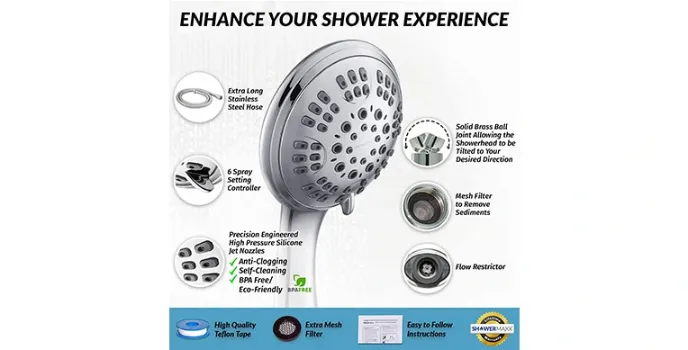 The self-cleaning techniques with the antimicrobial property flush out the sediments from the hard water etc. The showerhead connects to a heating appliance and can react when not mechanically sound. The heat resistance protects the showerhead with solid ABS construction. This showerhead is a quality-centric, high-end, built-in ergonomic style for every bathroom appliance. The chrome finishing of the hose shields the inner passage from damages.