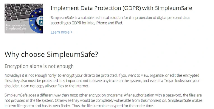As per GDPR for Mac, iPhone, iPad, SimpleumSafe is the best encryption software option for securing digital data, especially for personal users. As the platform follows the rule of making its files and folders for data protection, the end is met with efficiency. This ensures that the files and data in it are safe for a long time.