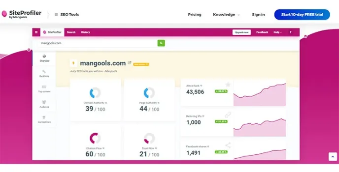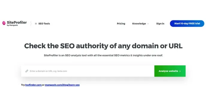 There are several tools available as Domain Authority Checkers and Domain Appraisal Tools across the market. But, SiteProfile has created a unique impression among users. This SiteProfile tool from Mangools is an efficient SEO analysis tool with all the required SEO insights and metrics. This Mangools SiteProfiler offers three different plans – Mangools Basic, Mangools premium, and Mangools Agency. Along with these SiteProfiler Plans, there is even a 10-day free trial, wherein new users can take advantage of this option to understand more about this DA checker tool.