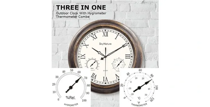 Looking for a waterproof outdoor clock in the 18 large outdoor clocks with a thermometer and hygrometer combo, then you can use the silent battery operated metal wall clock for the living room that comes in Sky Nature Clocks. This clock comes in bronze with the material type of metal with a round shape and no batteries included with a quartz movement.