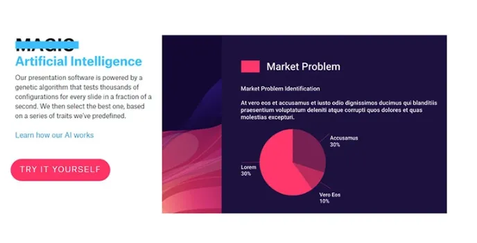 A genetic algorithm can test thousands of configurations for every slide within a few seconds and is a great presentation software. Once you select the most appropriate one, it will perform as desired. From start-ups to marketers to various sales teams, the automated approach to design the slides has helped thousands of companies streamline and create great presentations.