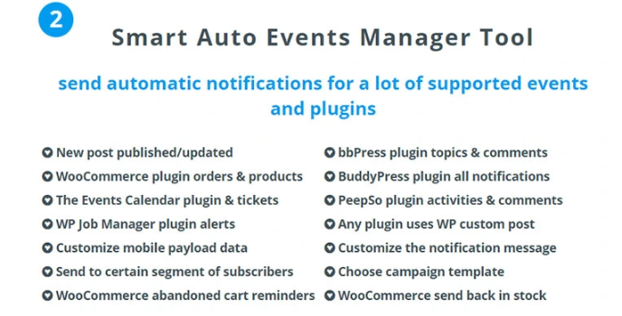Smartio Labs marketing tools offer a smart auto events manager tool and help send automatic notifications for tons of supported events and plugins. You can easily choose the campaign template, customize the notification message, and send it out to a certain subscriber segment.