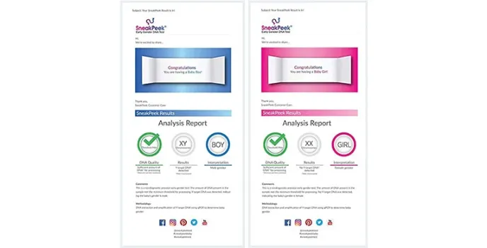 The best DNA Kits for the test as your order reaches you in 2 to 3 business days via USPS 1st class mail. Then you can send your collected sample back to SneakPeek Labs with the available prepaid postage via USPS Priority Mail. The test sample arrives in about 2 to 3 business days, and you can receive the gender results the following next day between the mid-day. This SneakPeek DNA Kit is very accurate, and you can take up this test after eight weeks into pregnancy. You can leave the test kit unopened until you complete your eight weeks.