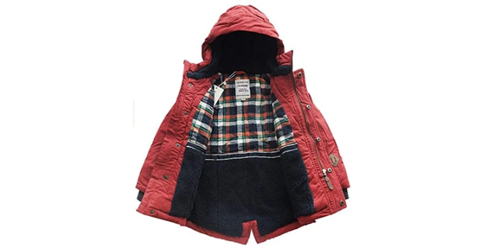 The winter coats for kids use a super soft Sherpa and brushed cotton fabric when it comes to the lining. The double sleeve cuff with an elastic rib inside makes it quite easy to work with. It also includes a zip-up to the chin with a ribbed collar inside and a Sherpa lining hood with an adjustable hem. It consists of all the details for keeping your kids warm in cold, harsh weather as well.