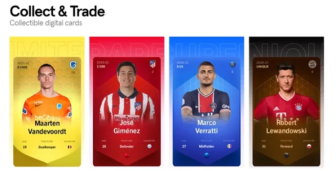 The Sorare NFT Gaming offers collectible cards with different season limits, including Maarten Vanevoorrdt (Limited - 1000 per season), Jose Gimenez (Rare - 100 per season), Marco Verratti ( Super Rare - 10 per season), Robert Lewandowski ( Unique - 1 per season).