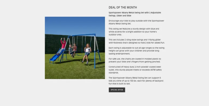 In addition to its wide selection of swings, Sportspower also offers a variety of other outdoor play equipment, including trampolines, basketball hoops, and more. So no matter what your child's interests may be, there's probably a Sportspower product that can accommodate them.