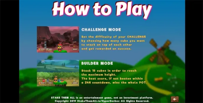 Stake Them All is all about putting up with stacks. The player should stack at most minuscule 15 cubes to reach the highest point. The best score wins if no one in 24hrs maximum beats it. The player then wins the whole game if no one claims more than the maximum score.