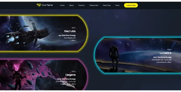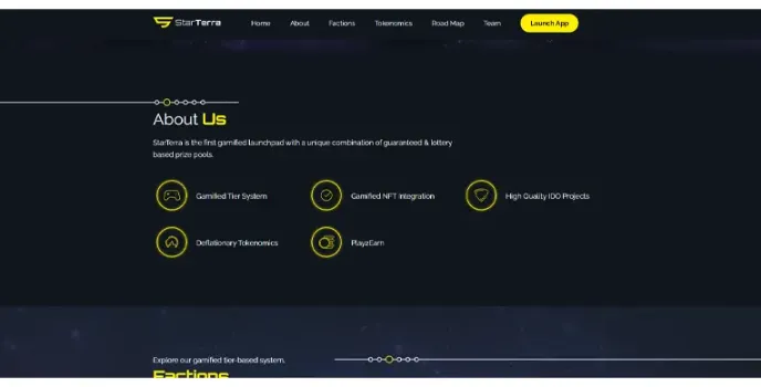 StarTerra is a gamified launchpad built on the Terra ecosystem and offers guaranteed and lottery-based prize tools. The main features include a gamified tier system, gamified NFT integration, high-quality IDO projects, Deflationary Tokenomics, and more. The Terra Launchpad hosts five fractions in their gamified tier-based system, introducing competition between fractions and inside each of them. The StarTerra Launchpad allows users to stake $STT native tokens and buy IDO tokens. There is also a special gamified leaderboard that reflects the players’ activity.