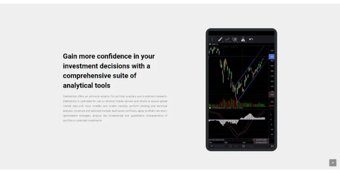 Statmetrics provides investment research and an All-in-One solution for portfolio analytics. This free backtesting software can be used on Android mobile devices due to its optimization. It allows access to global market data monitor and performs charting. Statmetrics constructs technical analysis and backticks multiple multi-asset portfolios and applies to portfolio risk-return optimization strategies to analyze potential portfolio investments' quantitative and fundamental characteristics.