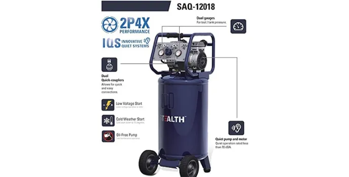 Stealth 20-gallon ultra-quiet air compressor is High capacity compressor that also has a reinforced grip. That grip is the main advantage of this compressor.