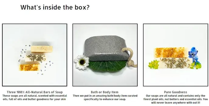 The company has products that are infused with essential oils. People have realised the importance of essential oils. The pack consists of 3 soaps and 1 spa product in the subscription boxes. The ingredients are also mentioned in the boxes.